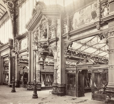 Galerie i pawilony były zbudowane i urządzone w różnych stylach i materiałach, które odzwierciedlały charakter i tematykę wystawianych eksponatów i kolekcji. Niektóre z nich były zbudowane na stałe, a niektóre były tymczasowe i demontowane po wystawie. Niektóre z nich były zbudowane w stylu klasycznym i historycznym, a niektóre w stylu nowoczesnym i oryginalnym. Niektóre z nich były zbudowane z kamienia i metalu, a niektóre z drewna i tkaniny. Niektóre z nich były zbudowane na wzór znanych budowli i obiektów, a niektóre były zbudowane na wzór egzotycznych i fantazyjnych konstrukcji.